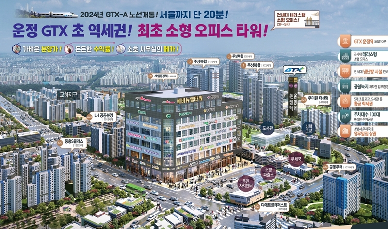 운정 애비뉴엘타워. GTX운정중앙역 도보권 상업시설. 운정 최초 소형 오피스타워! 전세대 테라스 소호사무실 임대/분양