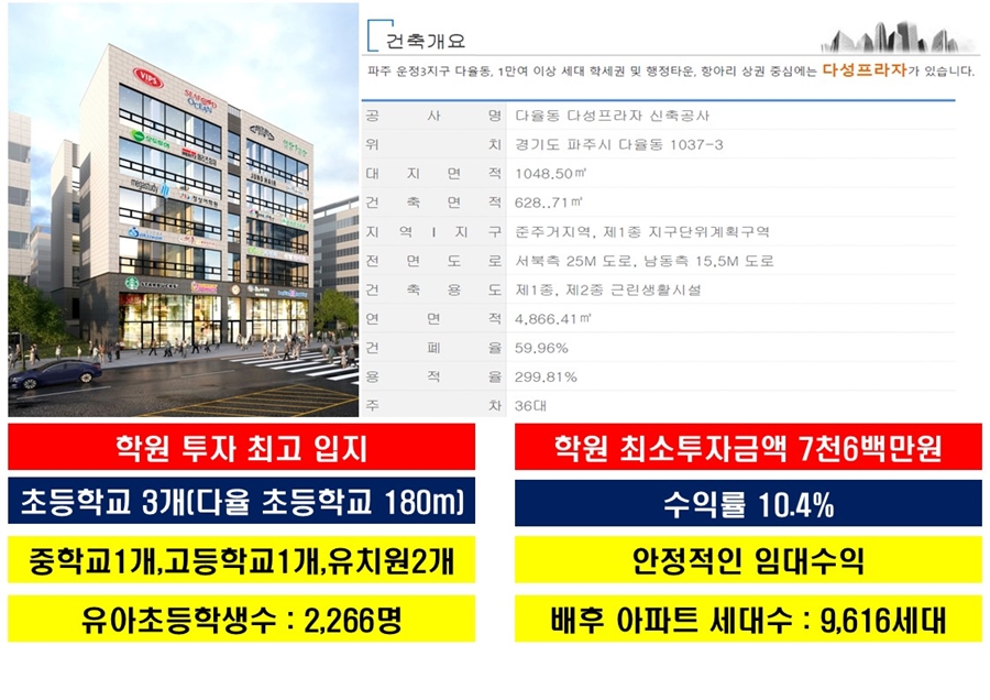 파주운정신도시 해오름마을의 다성프라자 임대와 분양을 진행합니다.  해오름마을은 파주운정신도시에서 주거배후세대로 약 1만세대 이상의 대규모 고정배후수요가 있는 아파트 단지로서 많은 아이들과 주거인구가 거주하고 있는 지역입니다. 무엇보다 이번 다성프라자는 다율초등학교와 다율중학교 바로 앞에 들어서는 상가건물로서 학생들을 위한 학원업 프렌차이즈분식점 버거집 등이 인기를 끌 것으로 보입니다.