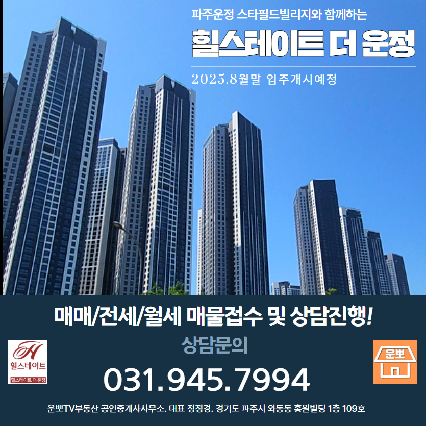 힐스테이트 더 운정 힐스테이트 더 운정은 파주운정신도시의 49층 랜드마크 주상복합으로서 2025년 8월말부터 입주를 개시하는 주거용 오피스텔과 아파트 공동주택으로 구성되어 있습니다. 단지내에는 신세계 프라퍼티의 스타필드빌리지가 오픈될 예정이며 운정 스타필드와 함께 스트리트몰 모두 신세계프라퍼티에서 상업시설을 구성하며 파주지역 최고의 인프라를 갖춘 랜드마크 주상복합입니다.
